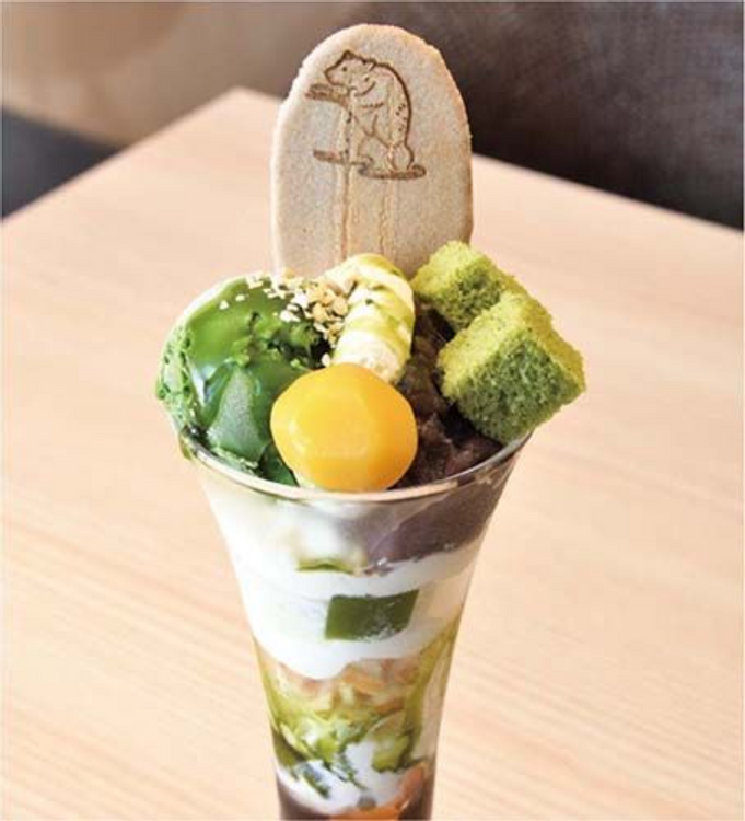 看板メニューの「抹茶餡パフェ」は、あんに合わせて調合する生クリームをはじめ、白玉、寒天、黒蜜に至るまで、素材一つひとつを専用に製造。「千秋庵総本家」発祥の和洋折衷せんべい「元祖山親爺」も砕き入れ、味の調和を最大限に追求した。たっぷりと乗るあんは、特別な炊き方でひと際粒立ち、濃厚な抹茶アイスと一緒に味わっても、小豆の風味を豊かに感じさせる。