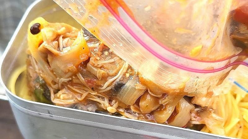 ラタトゥイユをゼロから作るとなると、切ったり炒めたりするのが面倒なので、できることは家でやってから山に持っていくのがおすすめです。