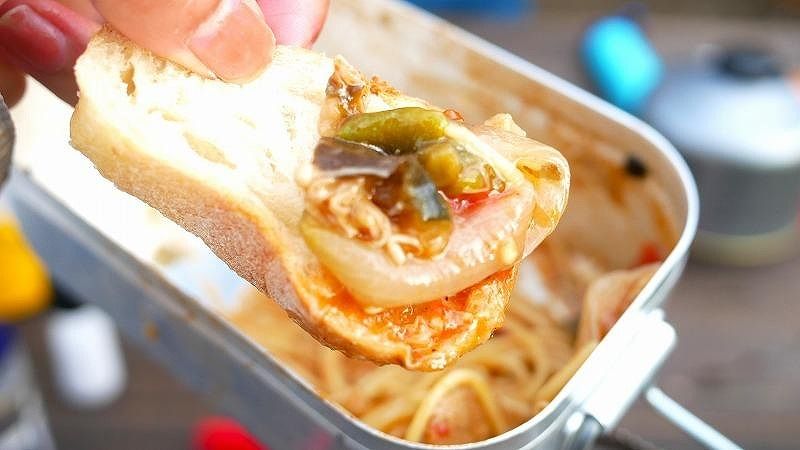 パンを使って、メスティンについたラタトゥイユをこそげとったら…次の料理!