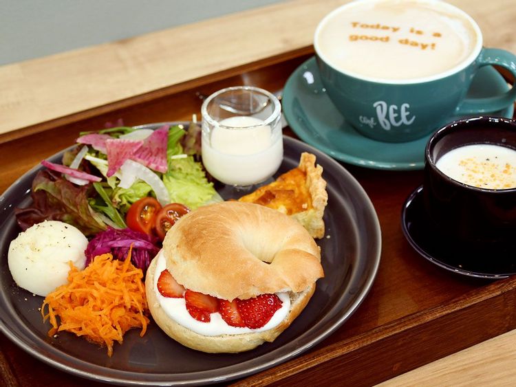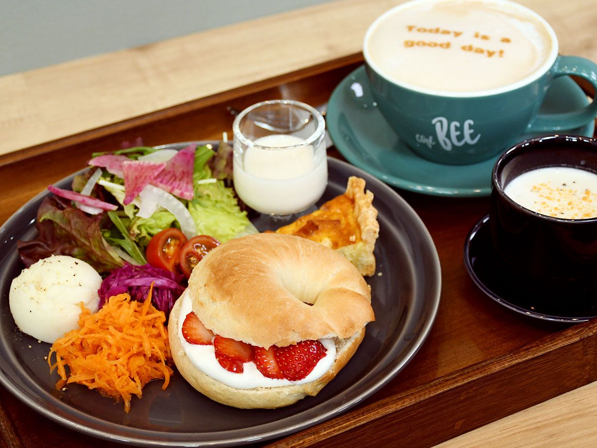 はちみつを味わうカフェというコンセプトどおり、様々な料理に使用しています。自家製ベーグルははちみつ湯で茹でて焼くことで、もっちりとした食感に。キャロットラぺやキッシュも、はちみつでやさしい甘さに仕上げています。このほか季節により西神楽の自社農園で採れた野菜がポタージュとして登場します。ランチ限定で1500円。カフェラテ付きは+550円。