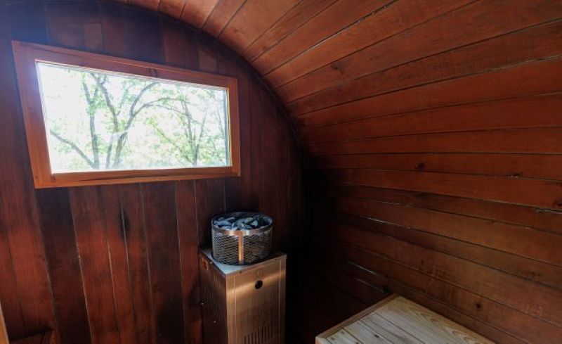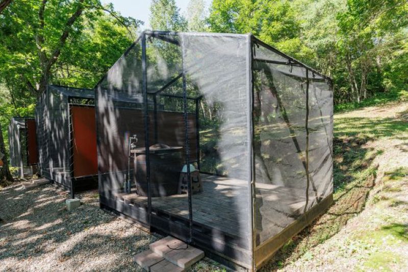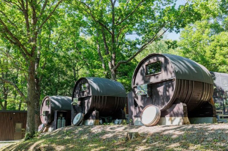 大自然の中にそびえたつ3棟のワイン樽。1988年〜2015年まで池田ワイン城で使用していたワイン樽がサウナに生まれ変わった。樽内には、フィンランド式ストーブを備え、ロウリュ用にワインアロマ水を用意。大樽の中が芳醇(ほうじゅん)な香りに包まれる。