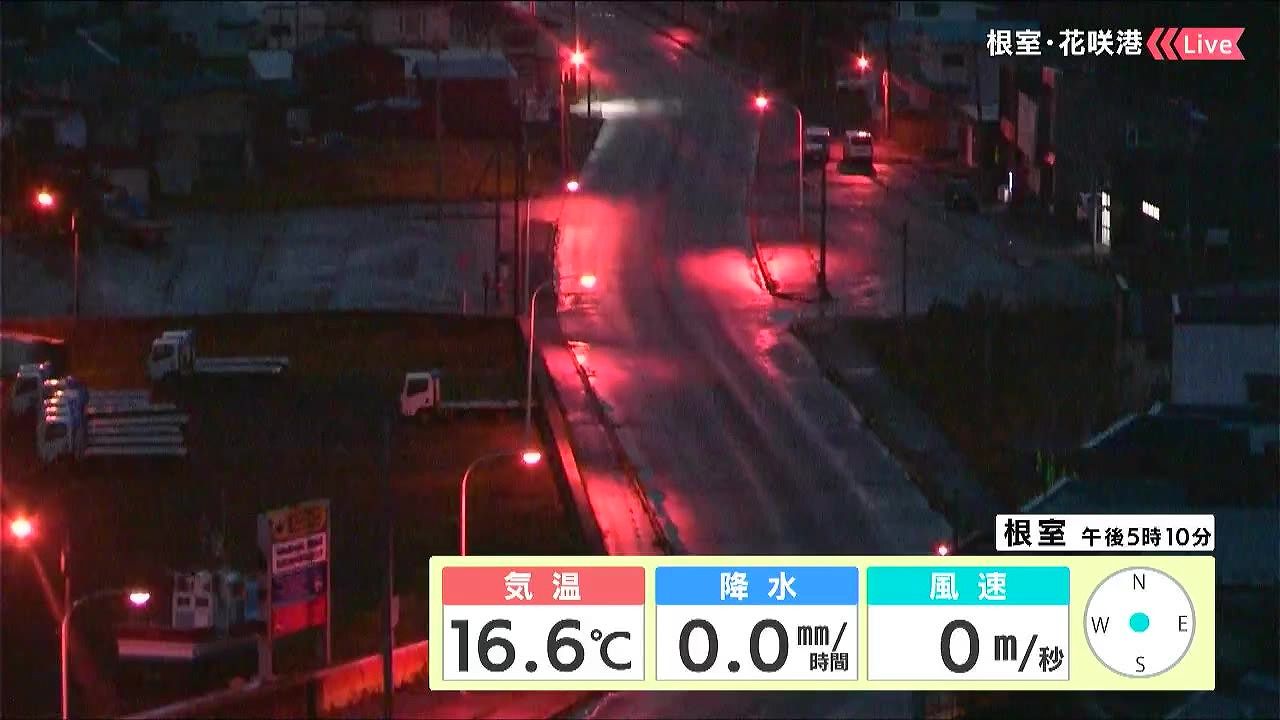 根室花咲です。暗くなってきましたが、路面が濡れています。