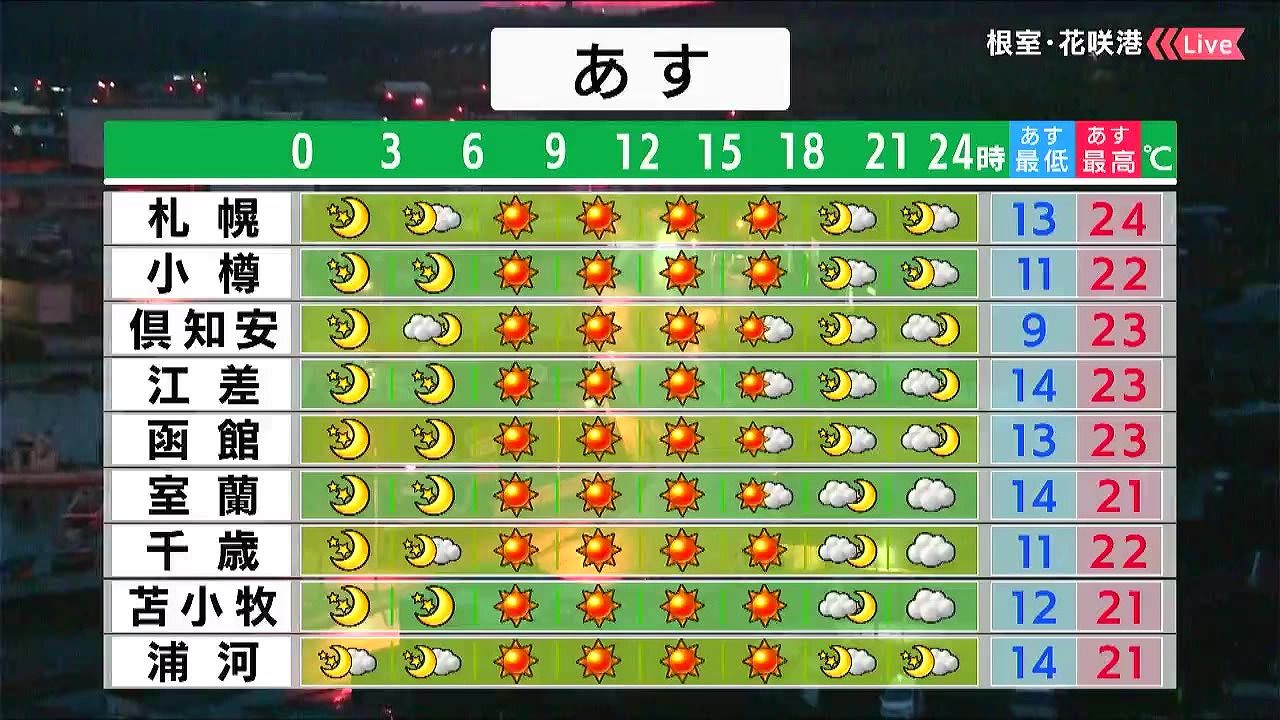 函館のきょう29日(月)の最高気温は9月上旬並みの24.3度でした。あす30日(火)もこの時期としては暖かく、さらに朝から日差しにも恵まれます。