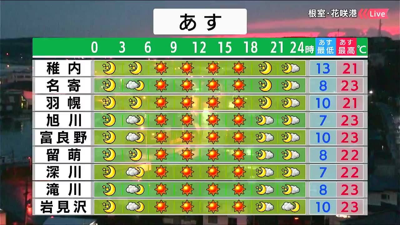 穏やかな秋晴れで、あすは「にわか雨」もないでしょう。ただ、晴れる朝は冷えて、旭川で7度などけさより5度前後低くなります。