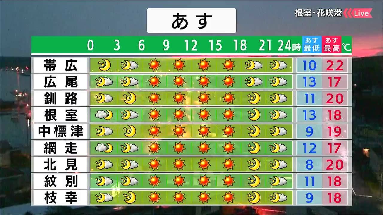 カラッと晴れて洗濯日和です。朝の気温は倶知安で9度など冷えますが、日中は20度を超え、札幌は24度。日ざしが暑く感じるでしょう。