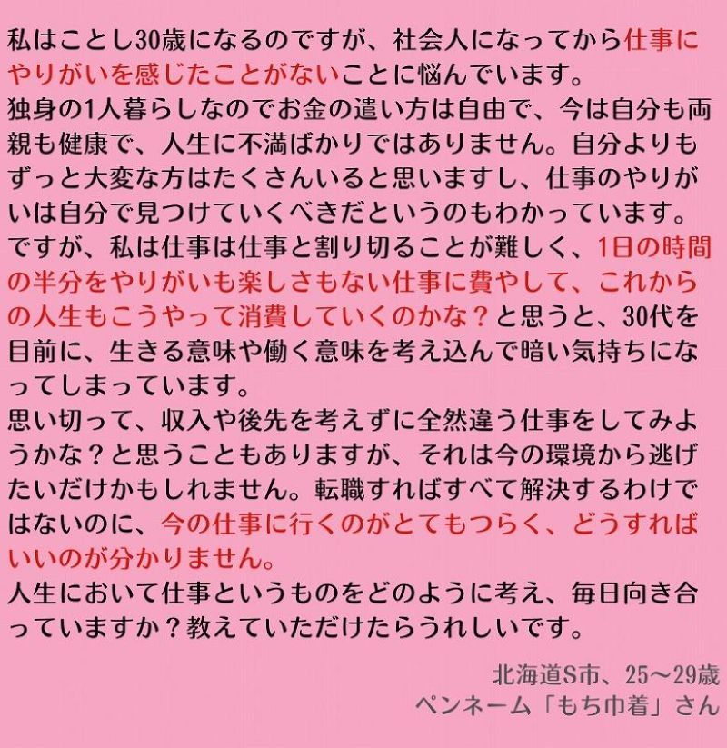 そうかぁ、やりがいを感じないというのはつらいし、労働人生から逃れるのが厳しいこの世の中では、生活していくに由々しき問題にもなりうるよね。