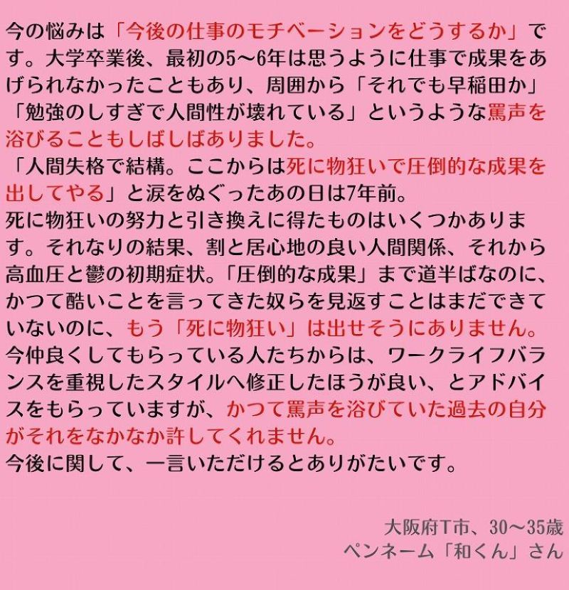 別の方からになるんだけれど、仕事のしんどさという話題で言えば、実はこんなお手紙ももらっていたのよね。