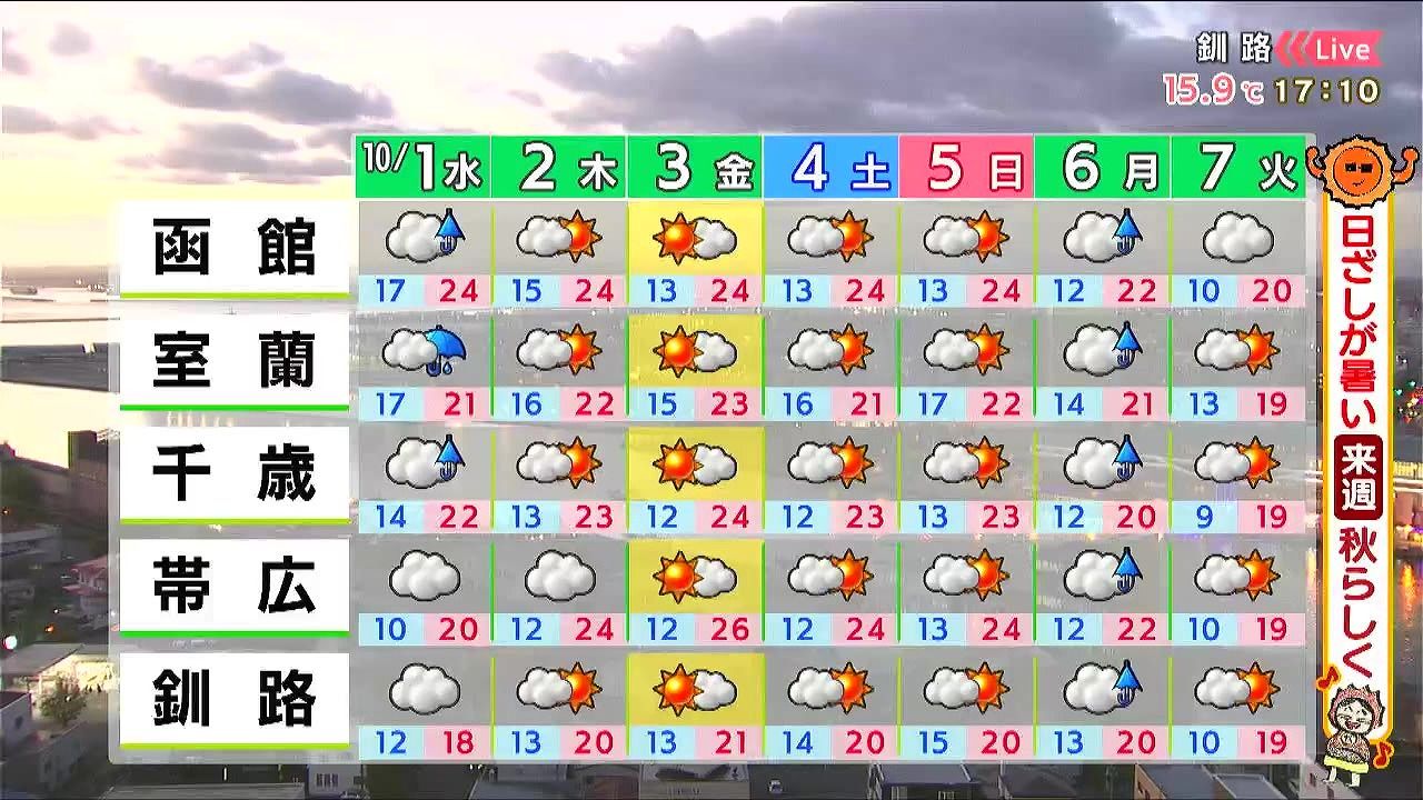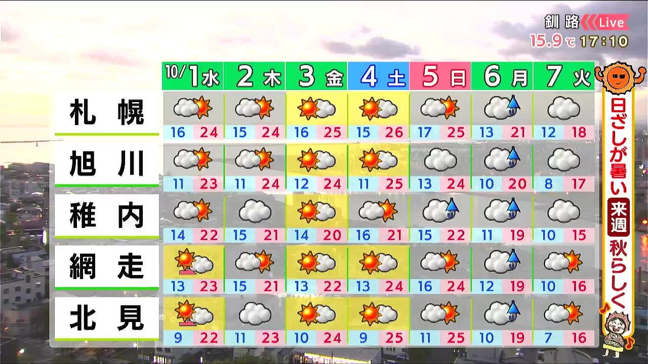 木曜は道北やオホーツク海側を中心ににわか雨のおそれがあります。週末は広く秋晴れで、札幌は史上初!10月に3日連続で夏日になり、土曜は26度まで上がるでしょう。