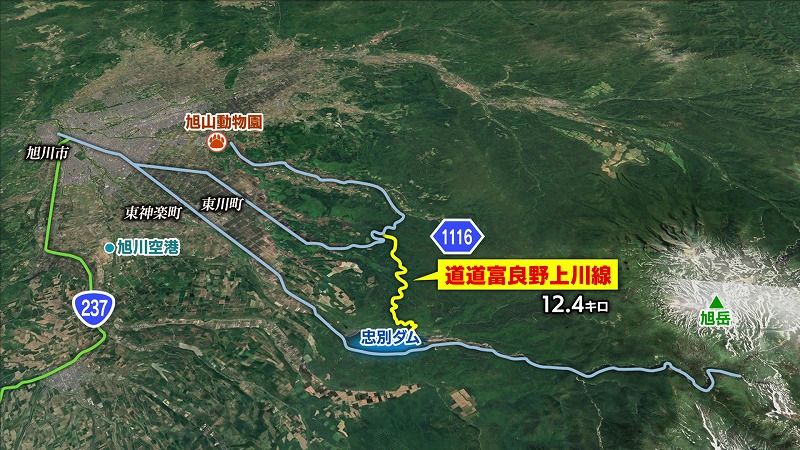 道道1116号線は、旭岳のふもとの忠別ダムと東川町の郊外を結ぶ、全長12キロの道路です。