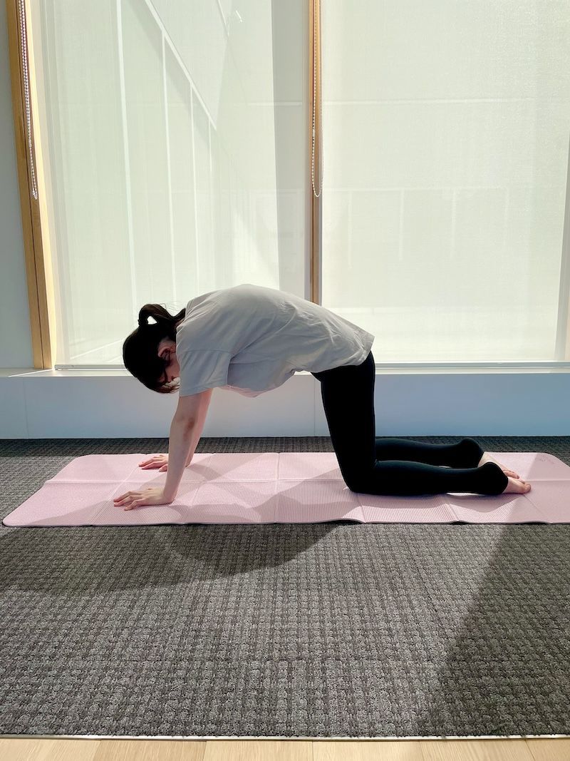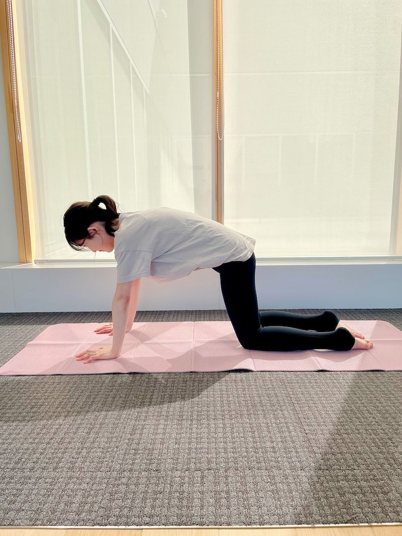 ① 四つ這いになり、両手は肩の真下、ひざは腰の真下になるように調整する。