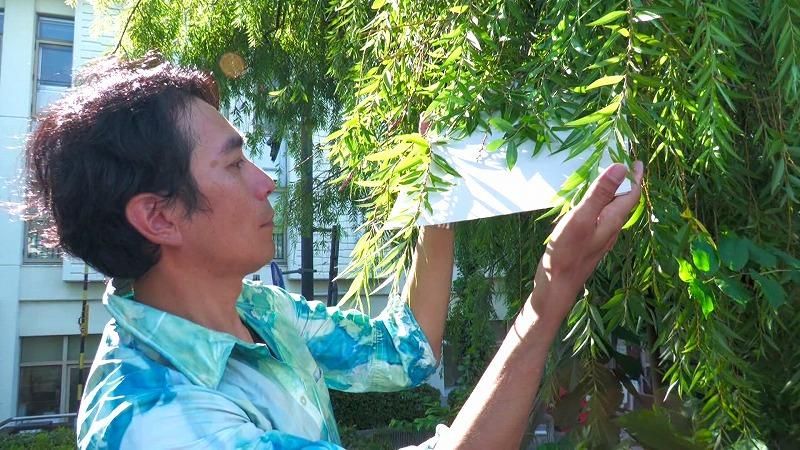 被爆してもなお、成長するシダレヤナギを8月6日の日光で姿を映し出して、作品を作り続けています。