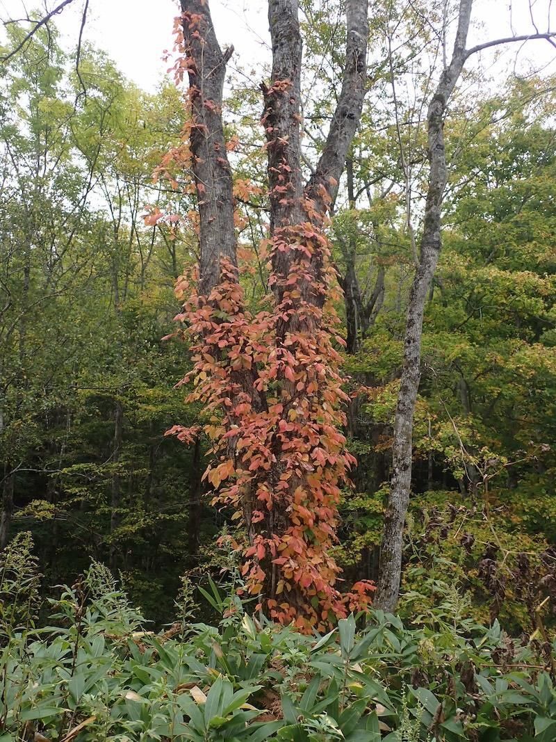 モミジ以外で目立つのが「ウルシ」の仲間で、さわるとかぶれることもある「ツタウルシ」は木に巻き付いて紅葉するので、10月上旬になると赤やオレンジの柱ができます。