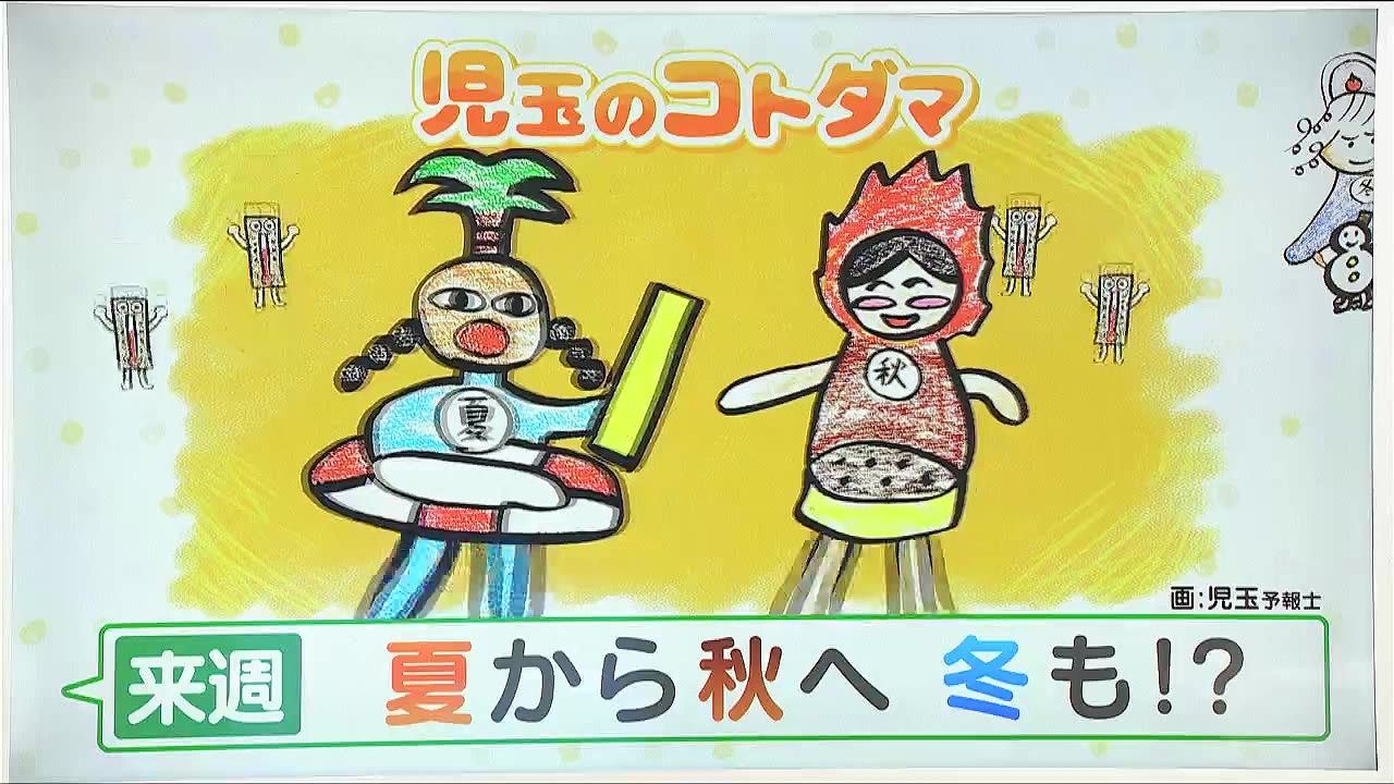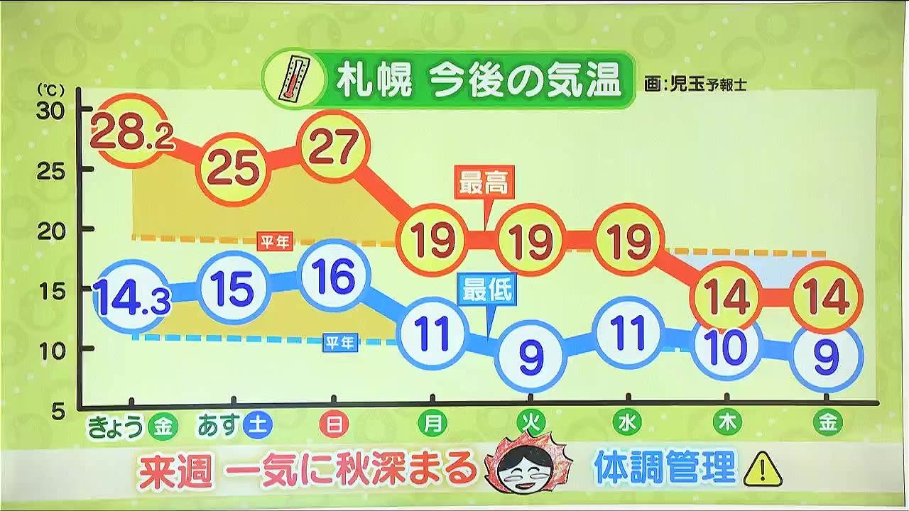 覚悟して見ましょう。日曜も夏日で暑さが続きますが、月曜日からは一気にこの時期本来の気温、最高気温でも20度に届かず、火曜の朝は一ケタ9度です。来週木金はもう一歩季節が進み、最高気温でも14度と寒くなります。一気に秋が深まります。