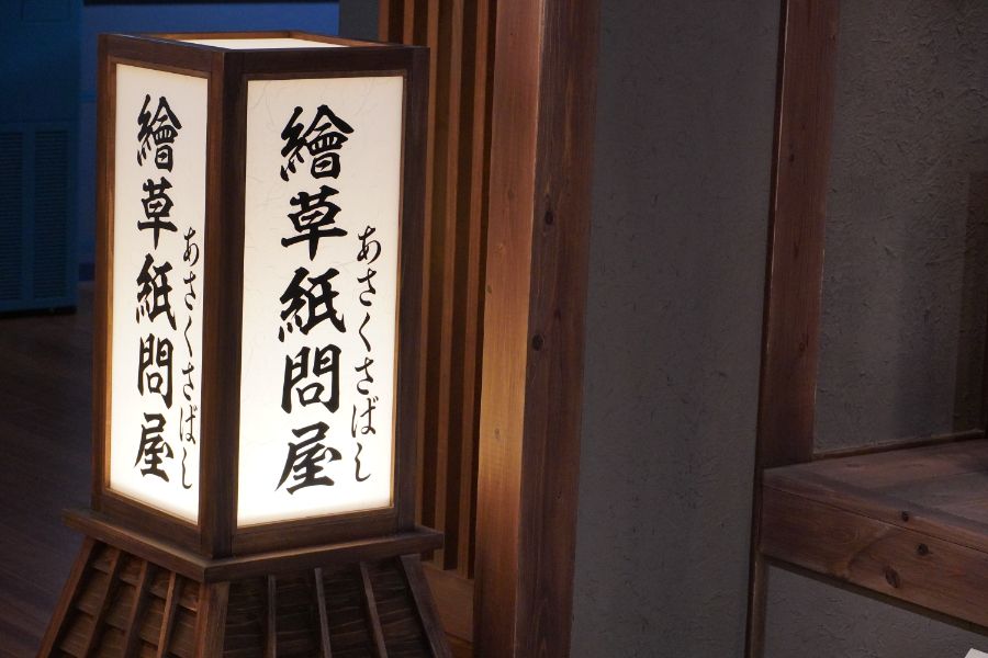 入口を入るとまず現れるのは、江戸時代に浮世絵を販売していた「絵草紙屋」の再現コーナー。行灯には「浅草橋」と刻まれており、まるで当時にタイムスリップした気分です。