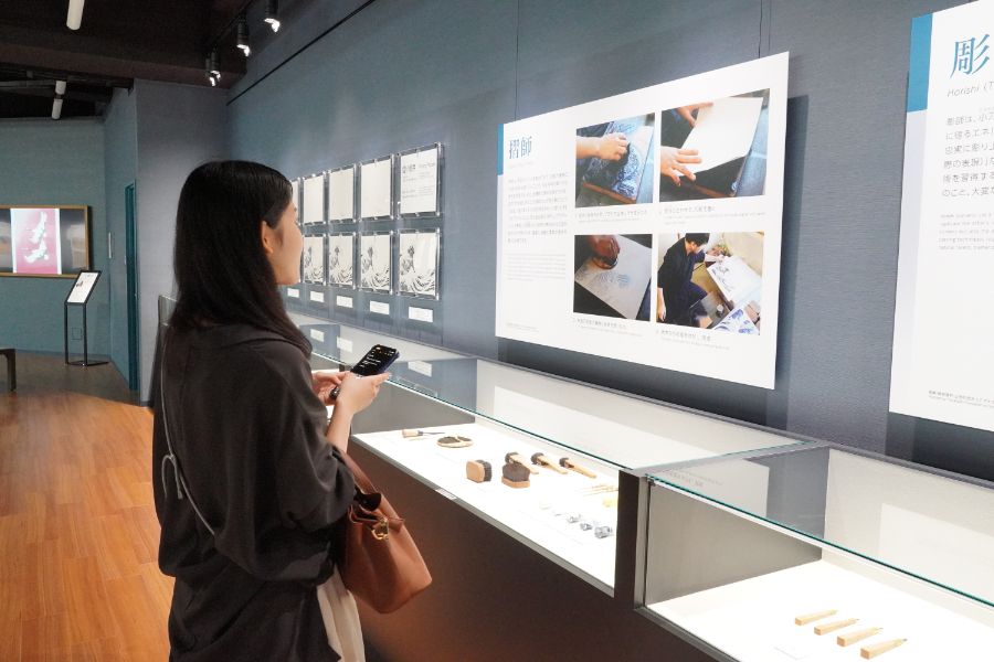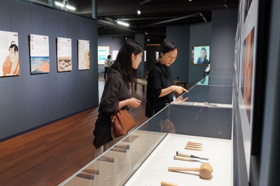続いて展示されているのは、浮世絵の制作過程。実際に職人さんが使用していた道具とともに、摺り工程の見本が紹介されています。