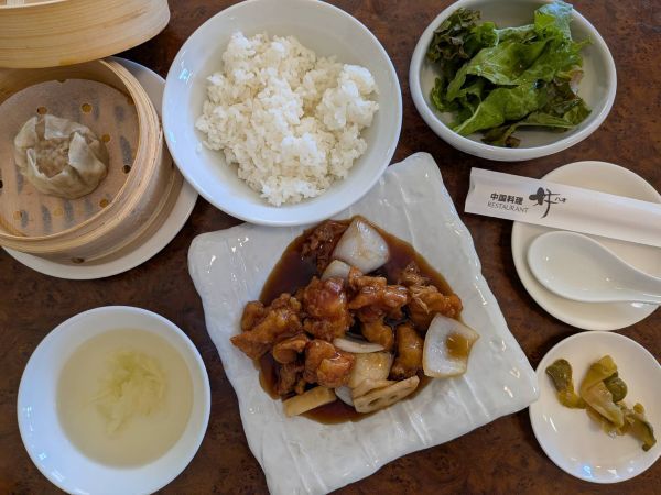 あんかけ焼そばで有名なお店ですが、他のメニューも食べてみようと思い、スタッフさんにオススメを聞いてみました。「答えは、あんかけ焼そばの注文が8割、あとは同じくらい」だそうです。結局自分で決めなければいけなくなり、私が選んだのは、ランチセットメニューの「鶏肉の甘酢セット」サラダ、ザーサイ、スープ、ライス、焼売がついていて、ボリュームたっぷり、これはお得です。