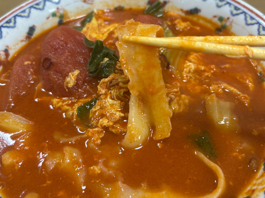小麦粉の塊を包丁で直接削り茹でる麺は、もちもちした食感と力強いコシが特徴です。特に「トマトと卵のピリ辛味」は、酸味、辛味、卵のまろやかさが絶妙に合わさり、誰でも食べやすい逸品。