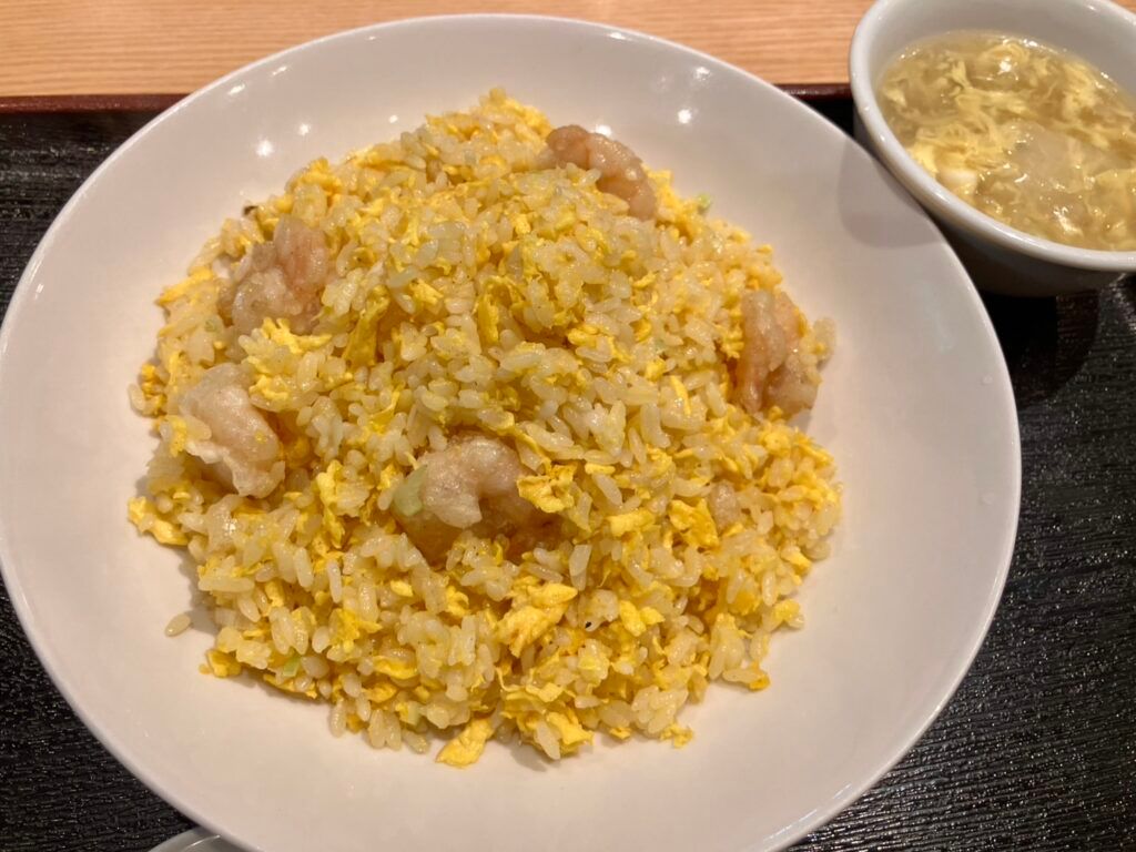 いただいたのは某SNSで評判高い「エビチャーハン」(960円)※スープ付。衣をつけてさくっと揚げたプリプリのエビがいっぱい入っている。こりゃエビ好きにはたまらないわ!