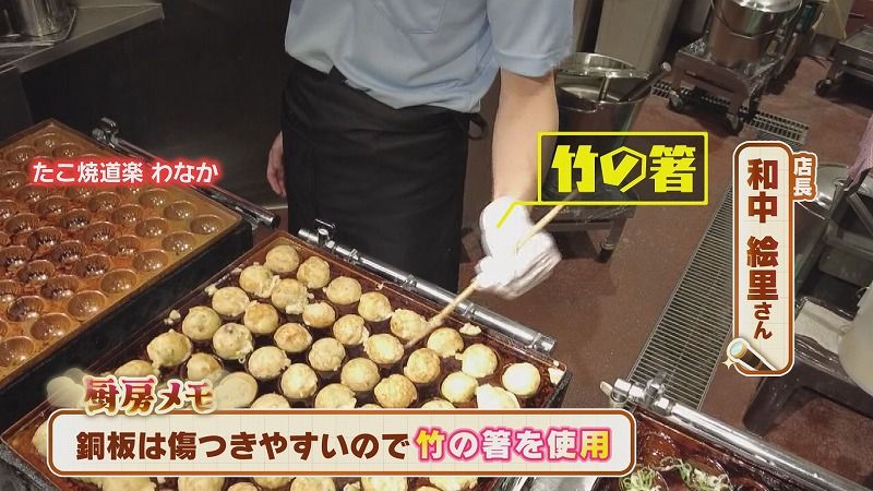 たこ焼道楽 わなか スタッフ:「(銅板は)傷が付きやすいので、竹のお箸を使って焼いています。7,000粒以上を5人とか4人で焼いています」