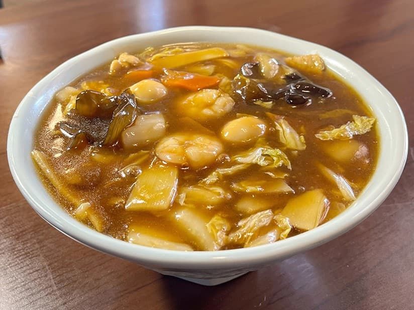 鶏ガラと豚骨の旨みが凝縮された醤油味の餡が、つるりとした麺と野菜に絶妙に絡む一杯!