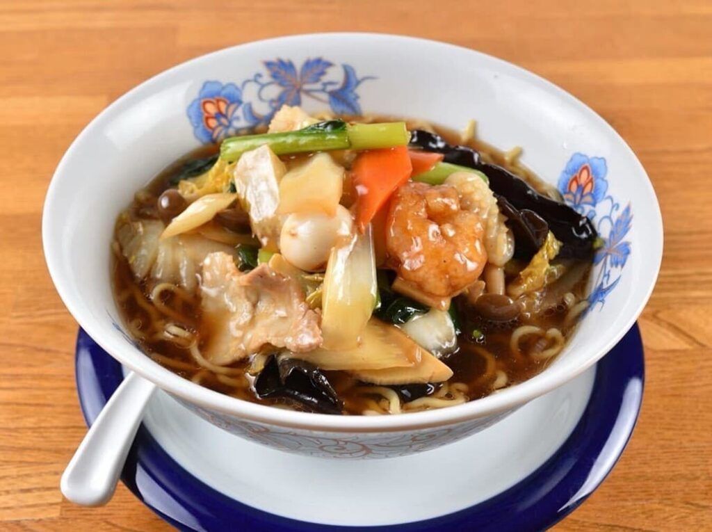 醤油ベースのあっさりとしたスープに、たっぷりの野菜、イカ、エビ、豚肉などが絶妙に絡む、栄養満点&食べごたえも抜群の一杯。
