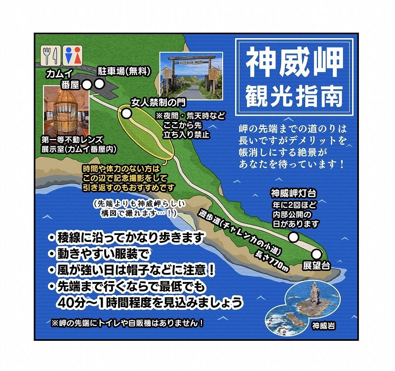 神威岬観光の際は、時間と体力に余裕をもって楽しんでください。