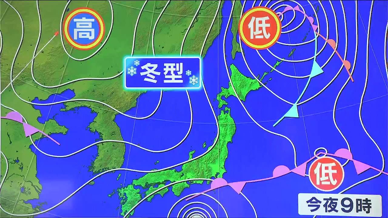 今夜9時の予想天気図を見ると、北海道の西に高気圧、東に低気圧。一時的ではあるんですが、西高東低、冬型の気圧配置になり、北から寒気が流れ込みます。あす9日(木)朝の寒気の予想を見てみると…