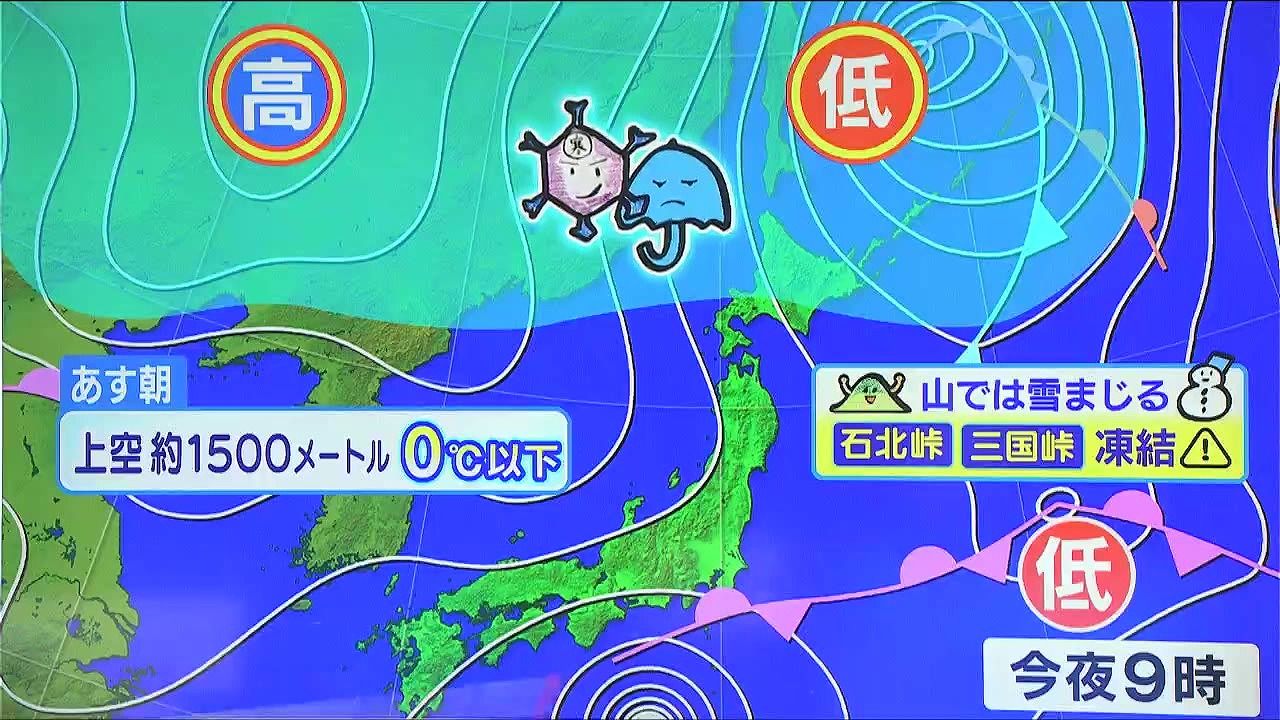 上空およそ1500メートル付近で0度以下の寒気に覆われます。寒気くんが雨を連れてきています。寒気の影響で雨が降り、標高の高い山では雪がまじります。標高が1000メートルを超える石北峠や三国峠などでは、路面凍結に注意して下さい。そして、気温の変化も大きく、あす9日(木)は寒くなりそうです。
