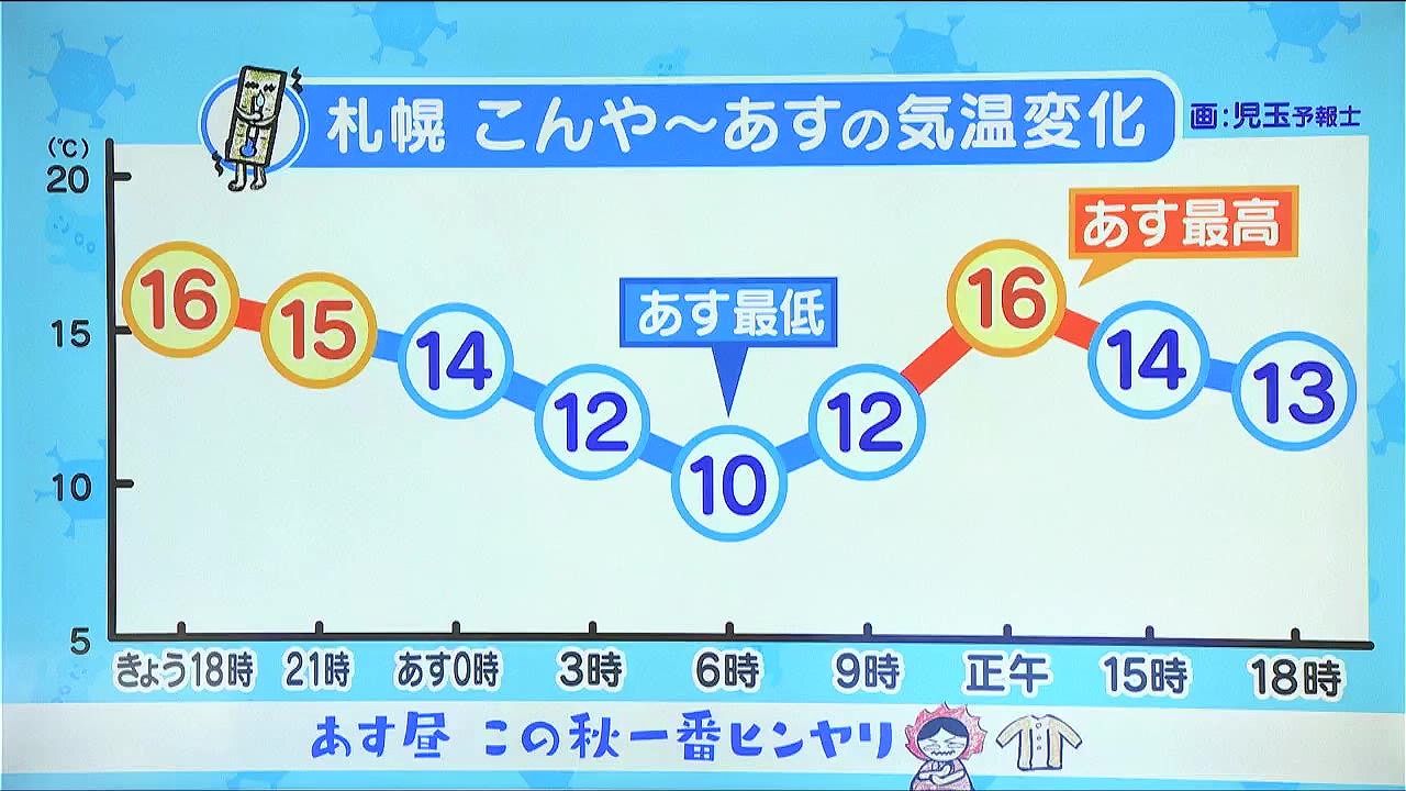 こちらは札幌の今夜からあす9日(木)日中にかけての気温変化です。これからグググと気温が下がり、あす)朝はけさより5度低い10度の予想です。そしてあすは日中の気温の上がり方が鈍くなるのもポイントです。最高気温はきょう8日(水)より7度低い16度。今の気温があすの最高気温ということで、あす日中はこの秋一番ヒンヤリしそうです。