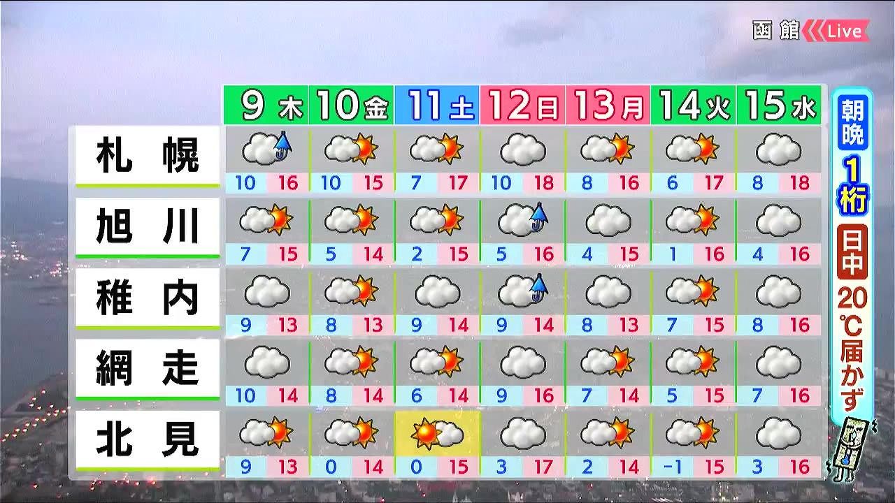 金曜と土曜は日が差しますが、朝晩は北見で0度など、内陸を中心に冷えるでしょう。日中も15度前後で上着が必要です。連休中日の日曜は道北で雨が降ります。