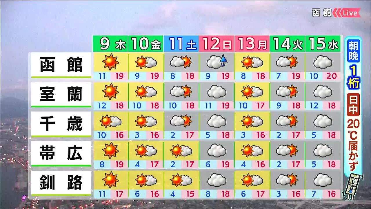晴れる日が多いですが、日曜は雲が広がります。気温は平年並みか高めですが、朝晩は函館でも一ケタ、日中も20度に届かない日が多くなるでしょう。