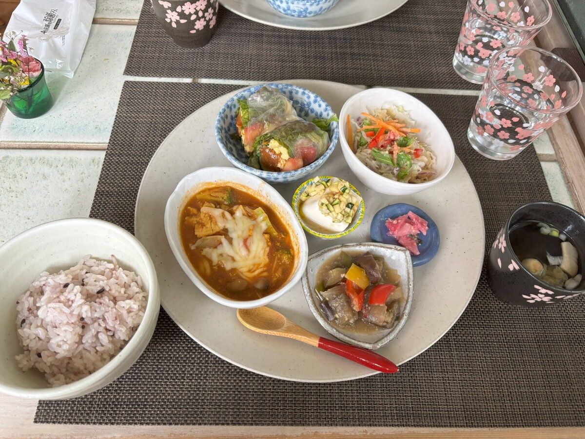週替わりでおかずが変わるみたいで、この日はタンドリーチキンカレー、生春巻き、ズッキーニねぎダレ冷奴、なすパプリカ、ピーマンの塩味噌和え、サラダに黒米のごはん、香の物でした。