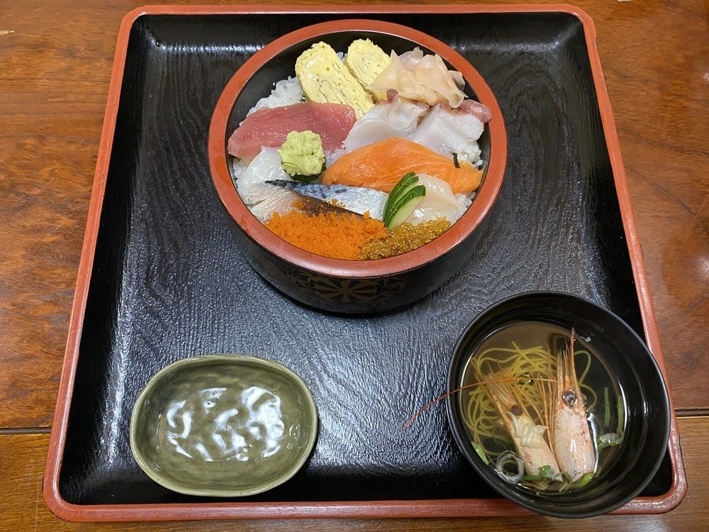 注文したのは「生ちらし鮨」。海老の頭と素麺が入ったお吸い物が添えられています。