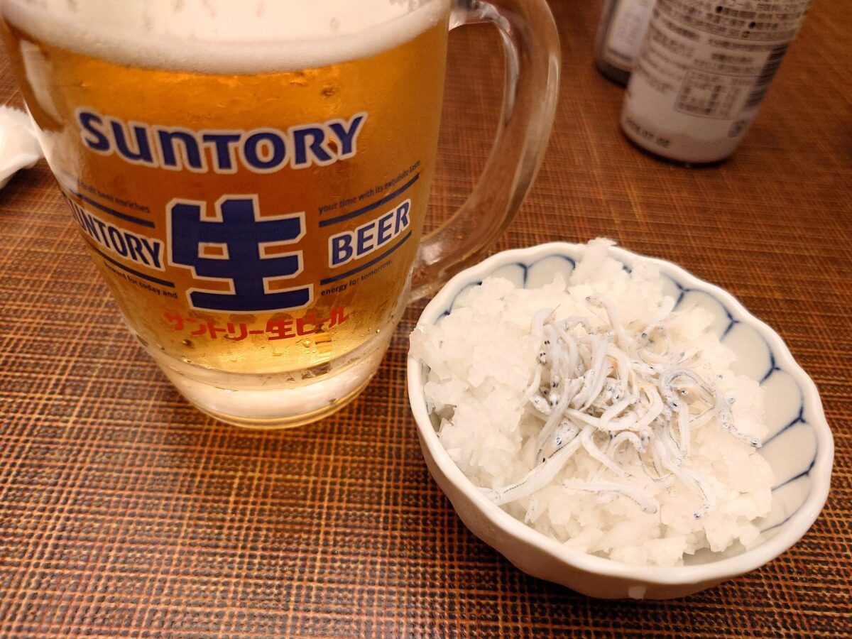 お通しと生ビール。サントリーのサンナマ。500円(税込550円)。