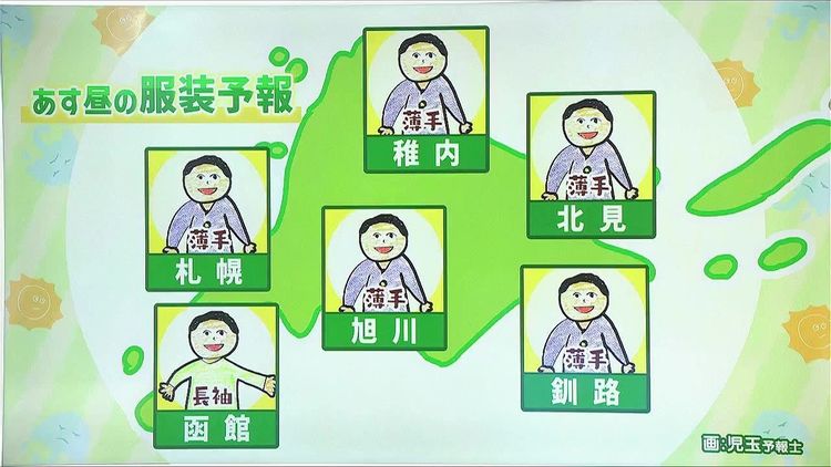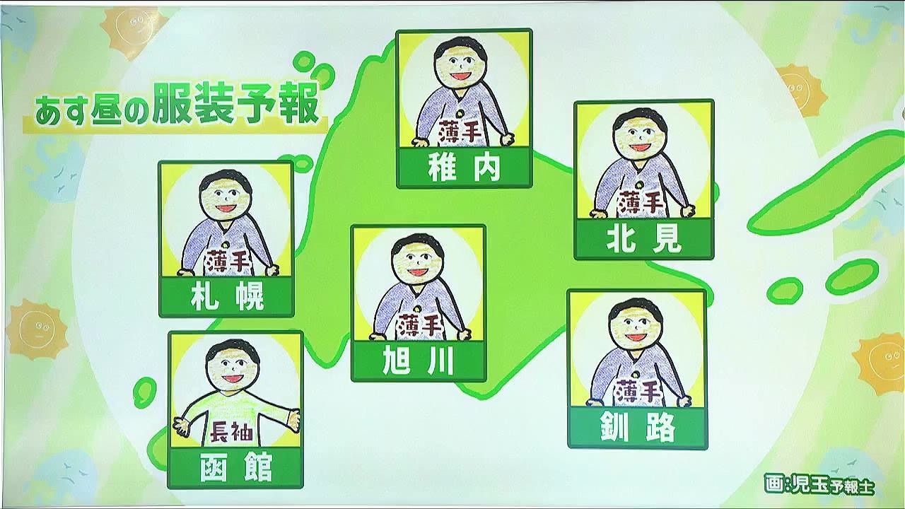 札幌や稚内、旭川、北見、釧路、広い範囲で15度以下、昼間でも上着が必要です。昼の服装予報なので、もちろん朝晩はもっと厚着が必要です。調節しやすい服装でお出かけ下さい。