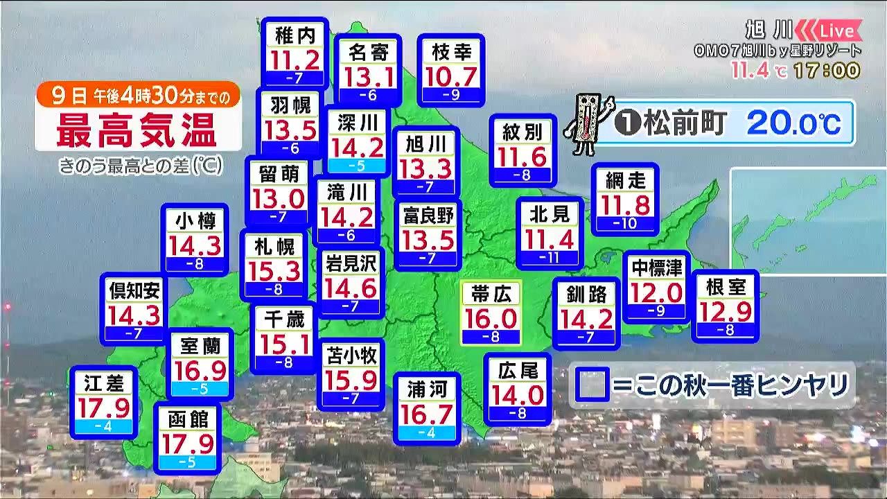 20度に届いたのは道南の松前町だけ。札幌は15.3度、稚内は11.2度で、下の段きのうと比べても大幅に低くなりました。