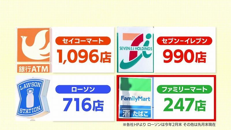 大手コンビニの道内の店舗の数はセイコーマートが1096店と頭一つ抜けていて、セブンイレブン、ローソンが追う展開、そこから離れてファミリーマートがあります。