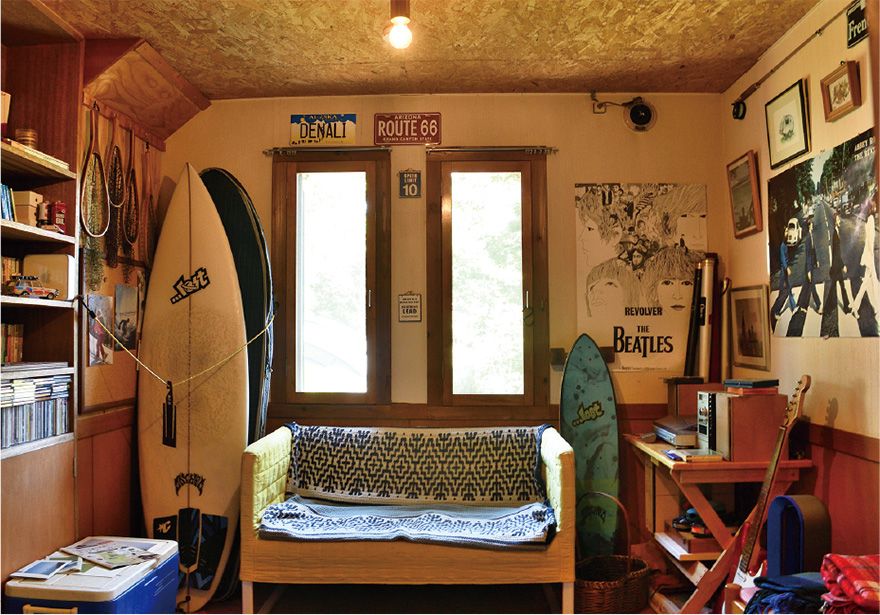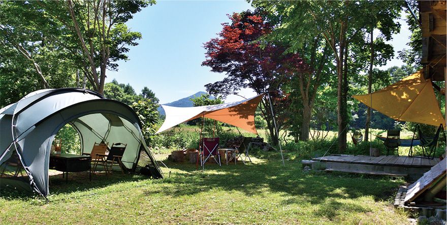 庭には自由に飲食できるタープやテントを設置。吉野山を望むログハウス周辺は、