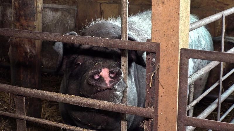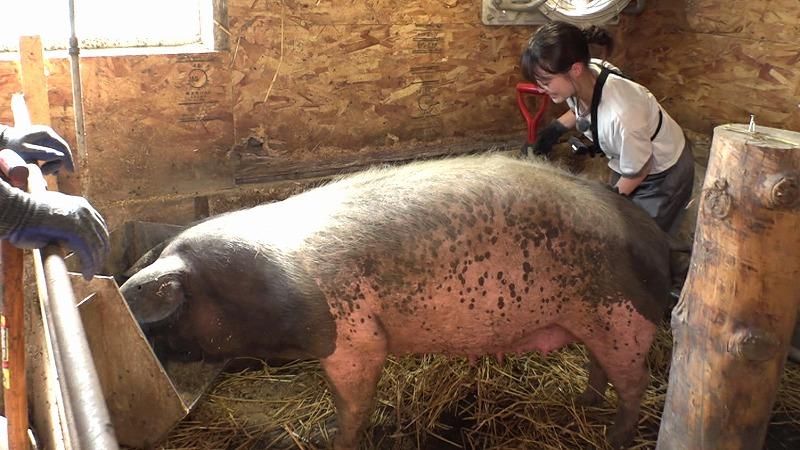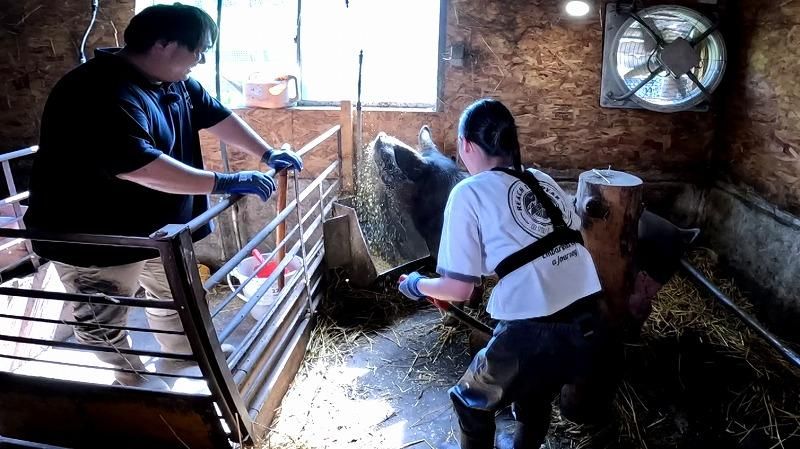 深める次は、1頭ごとにケージで飼育されている、来月出産予定のブタ小屋の清掃を行います。