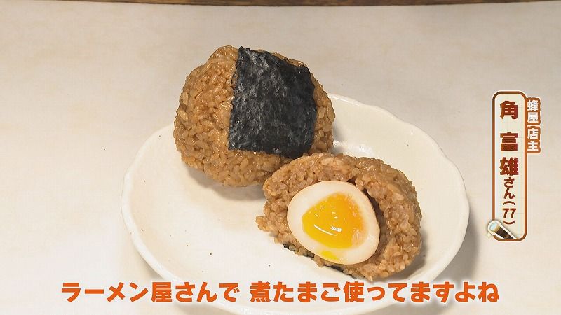 店主 富雄さん:「煮たまごおにぎり。ラーメン屋さんで煮たまご使っていますよね。煮たまごをおにぎりに入れたらどうなるのかなと思っていろいろやってみた。(販売から)20年以上経つかな」