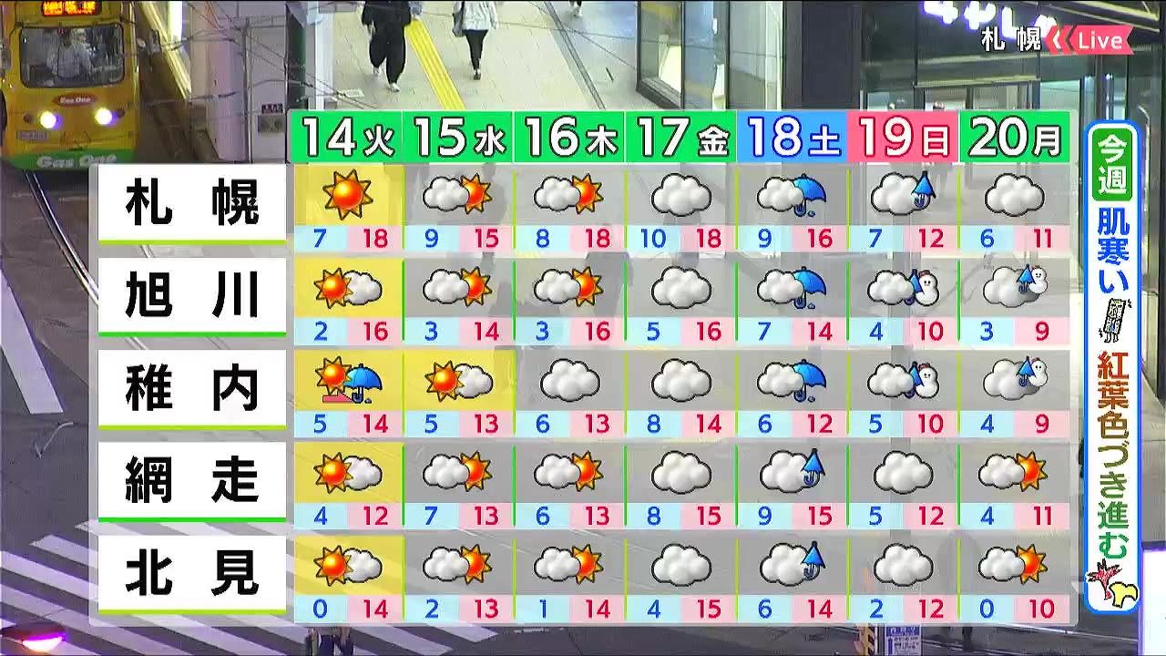 金曜まで天気の大きな崩れはなく、紅葉も色づきが進むでしょう。土曜の雨のあと上空の寒気が強まります。日曜月曜は旭川や稚内で初雪となるでしょう。道北にお住いの方や峠越えをする方はタイヤ交換を進めておきたいですね。