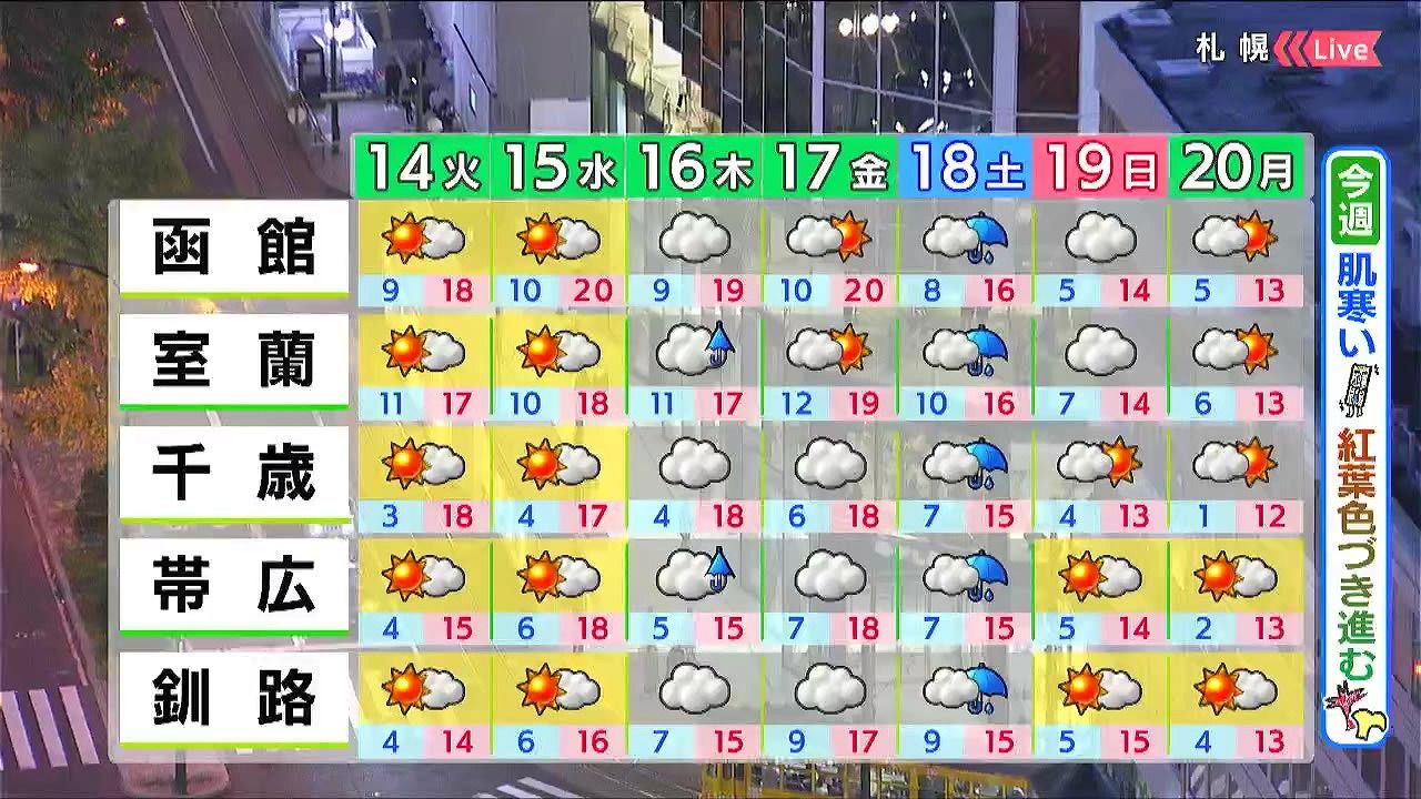 水曜も晴れますが、木曜は室蘭や帯広で雨が降るでしょう。土曜は雨や風が強まり、来週は一気に寒くなります。来週、峠では雪が積もるおそれがあるので峠越えは冬タイヤが必要です。