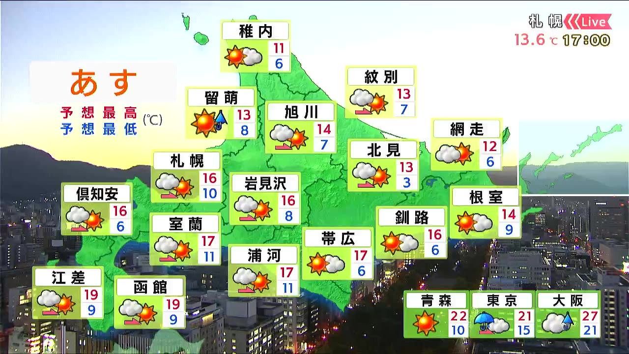 朝は上川や空知地方を中心に雨が降るでしょう。日中は天気が回復します。朝の寒さは今朝より緩み、朝も日中もこの時期らしい気温になります。
