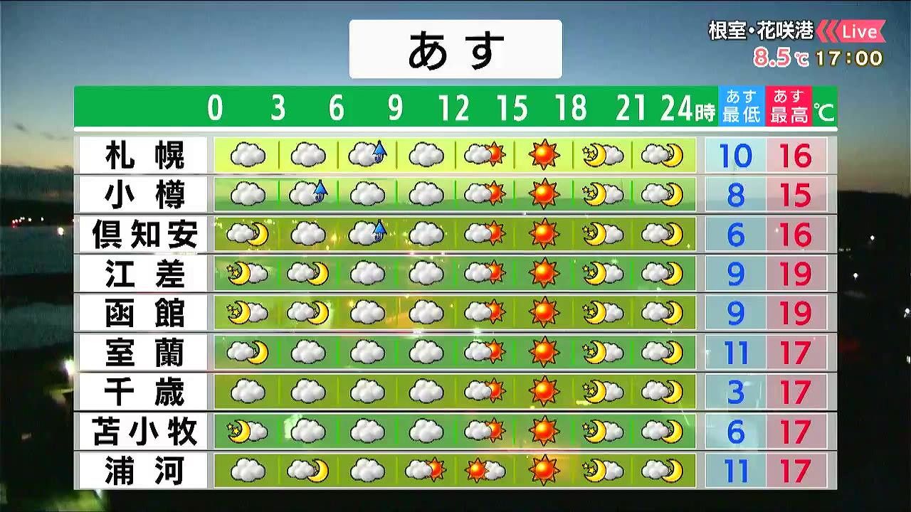 あす15日(水)の時間ごとの天気。道央・道南からです。