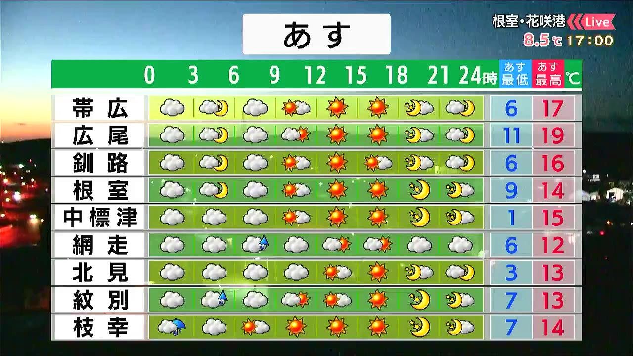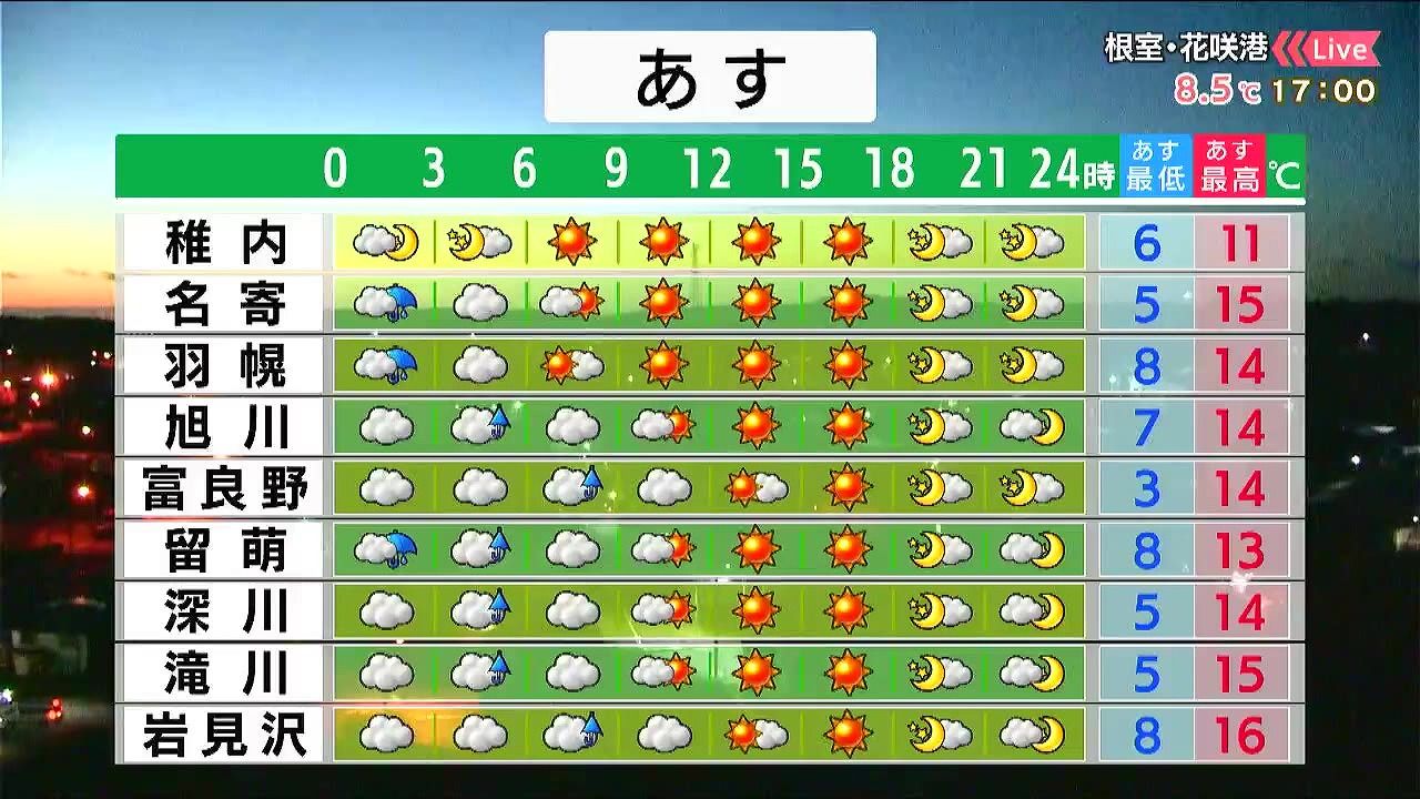 朝はオホーツク海側の海岸部で通り雨がありますが、午後は各地で日が差します。道東の内陸ではあす15日(水)朝も0度くらいまで気温が下がるでしょう。