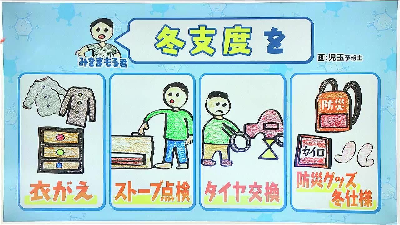 正解はこちら。「冬支度」でした。寒さや雪への備えが必要です。来週は上空に強い寒気が流れ込むため、今週中に衣替えにストーブの掃除や点検、峠越えをする方や道北の地域にお住いの方はタイヤ交換を進めましょう。そして防災グッズを冬仕様に。カイロや手袋など防寒グッズを入れる、あとポータブルストーブの準備もしておくといいですね。
