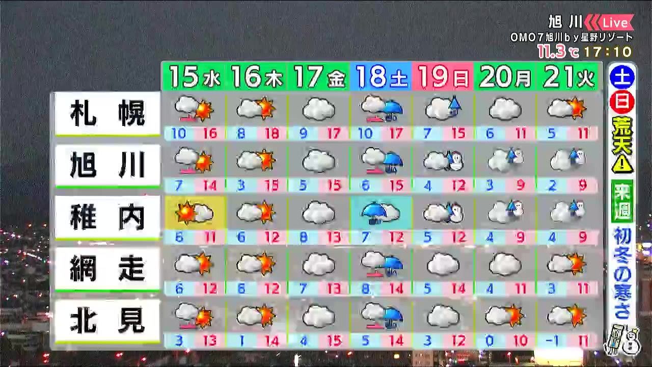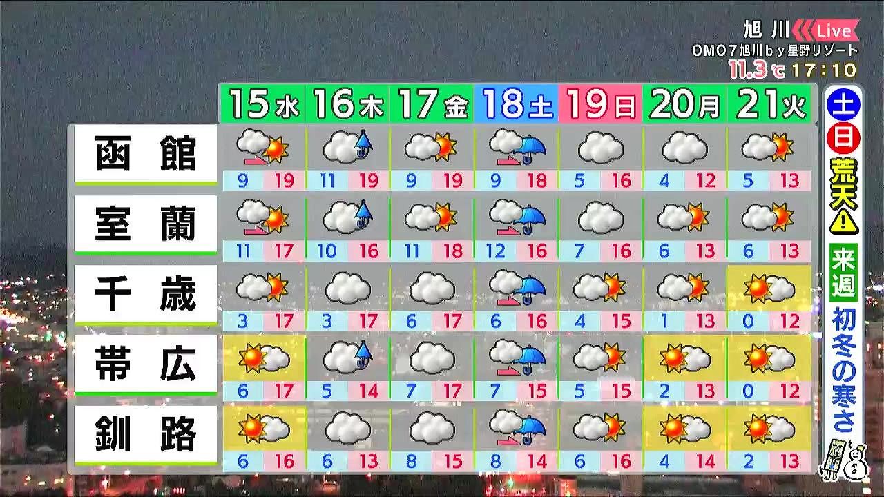 金曜まで天気の大きな崩れはないですが、土日は雨や風が強まり荒れた天気になります。雨の後、19日日曜は上空に強い寒気が入り、旭川と稚内で初雪になるでしょう。