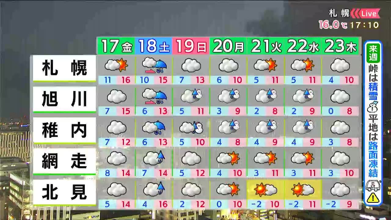 土曜の午後は日本海側を中心に雨や風が強まります。この雨のあと寒気が流れ込み、峠では日曜の朝から、旭川や稚内など道北の平地でも日曜の夜は雪が降り、路面凍結のおそれがあります。札幌中心部は日曜日以降、天気の大きな崩れはないでしょう。
