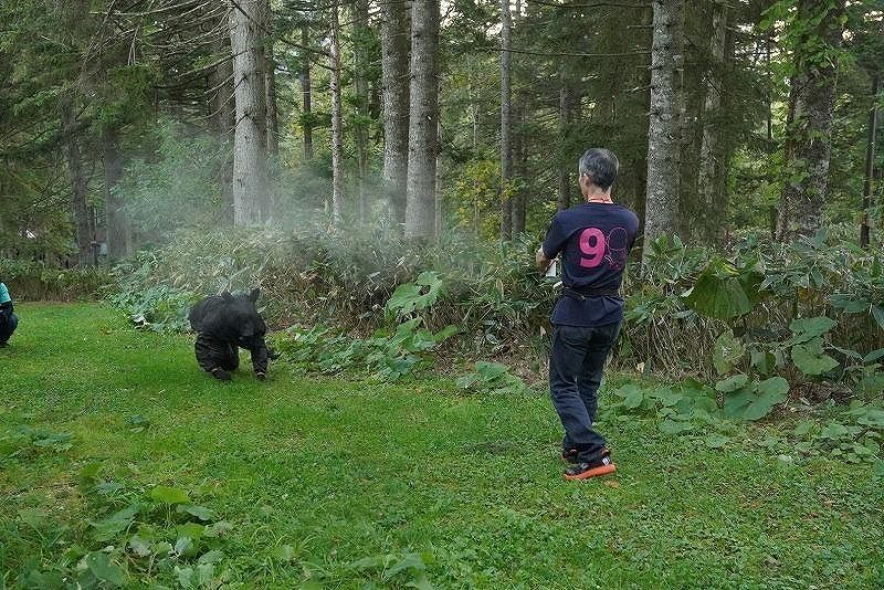 そこで風の強さや向きの感覚をつかんで、いざ近づいてきたときに勢いよく噴射しクマの鼻を霧で包むという流れを実践しました。