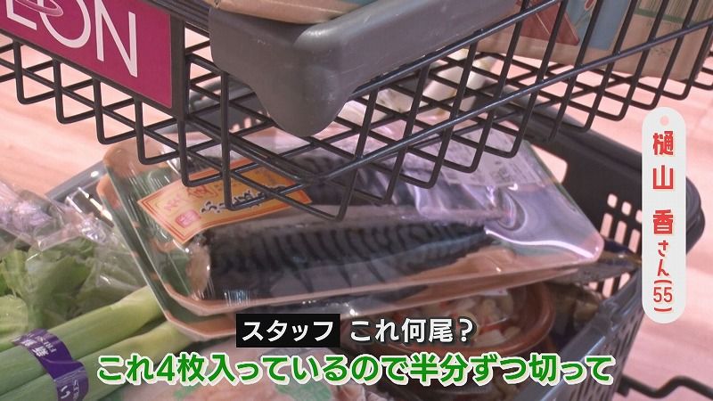 樋山さん:「魚も数買わないと。これ4枚入っているので半分ずつ切って他のものも付ければ足りると思う」